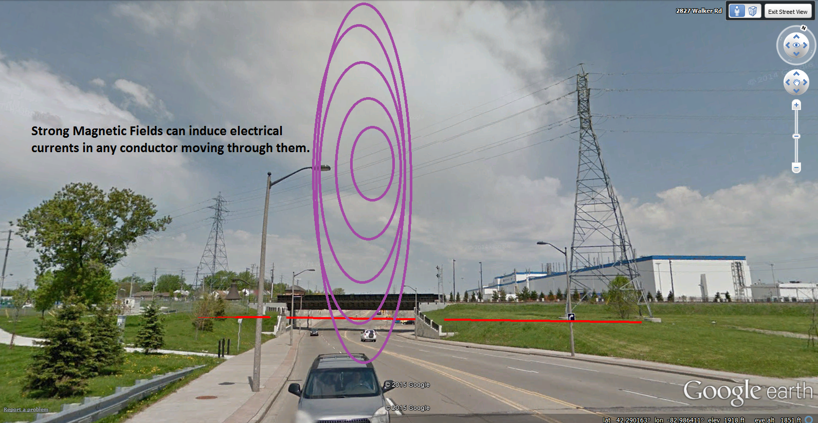 People drive under the power lines daily triggering instaneous electrical currents in conductors due to quickly changing magnetic field strength