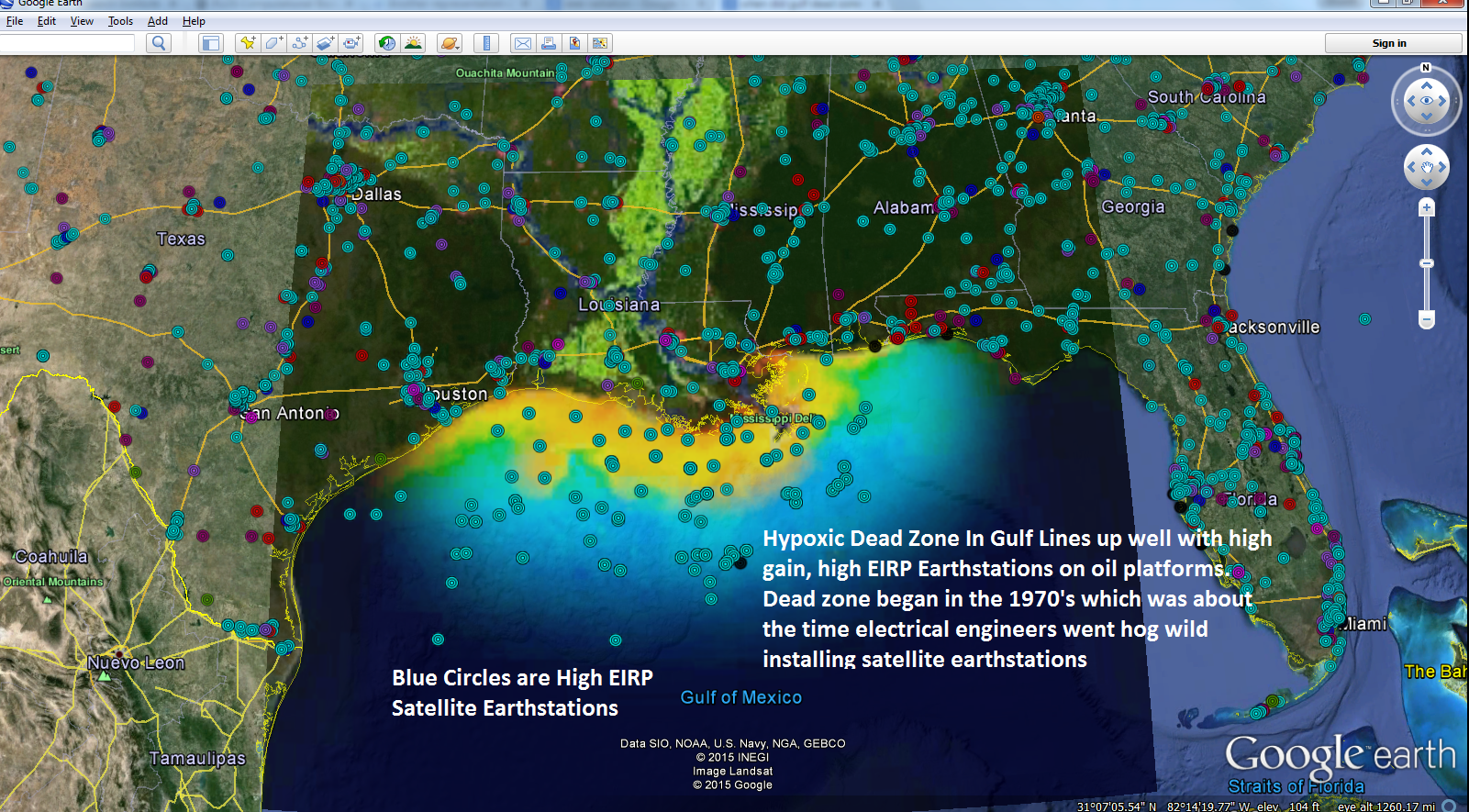 The electromagnetic fields from high EIRP Earthstations are refracting off the atmosphere and triggering hypoxic conditions in the gulf by reducing dissolved oxygen at the surface of the seawater as well as coupling with the sea surface and grounding out into the seawater triggering chronic, weak electrical currents, gradually killing everything in the local vicinity. PROVE ME WRONG. (Everybody else thinks it is nutrient loading…)