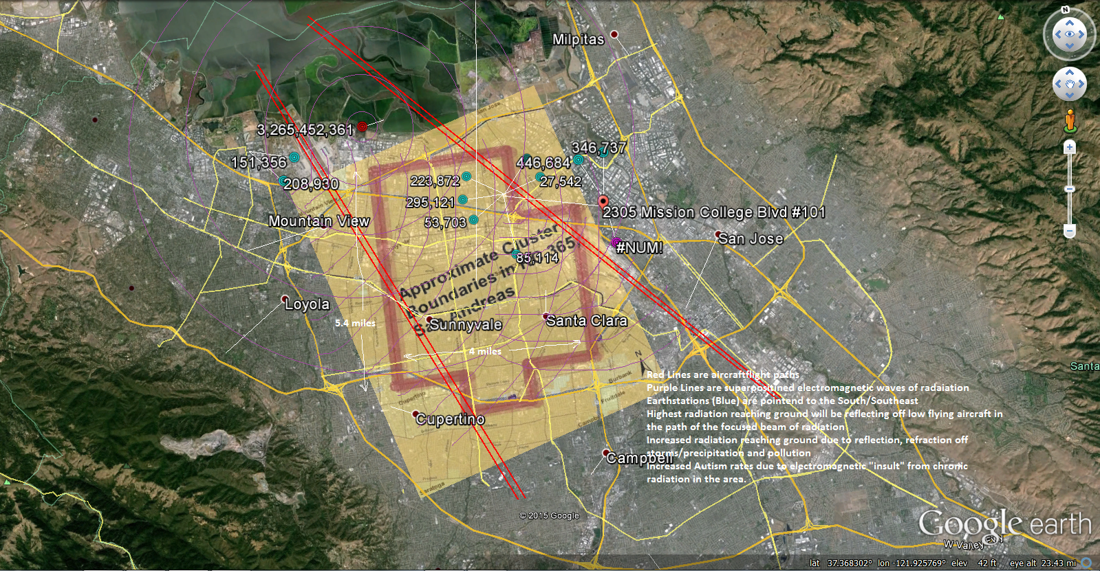 Santa Clara, CA Autism Cluster. Autism Map Credit UC Davis. Microwave Earthstations Blue, Pulsed Microwave Radars are Red. Red lines are airport flight paths
