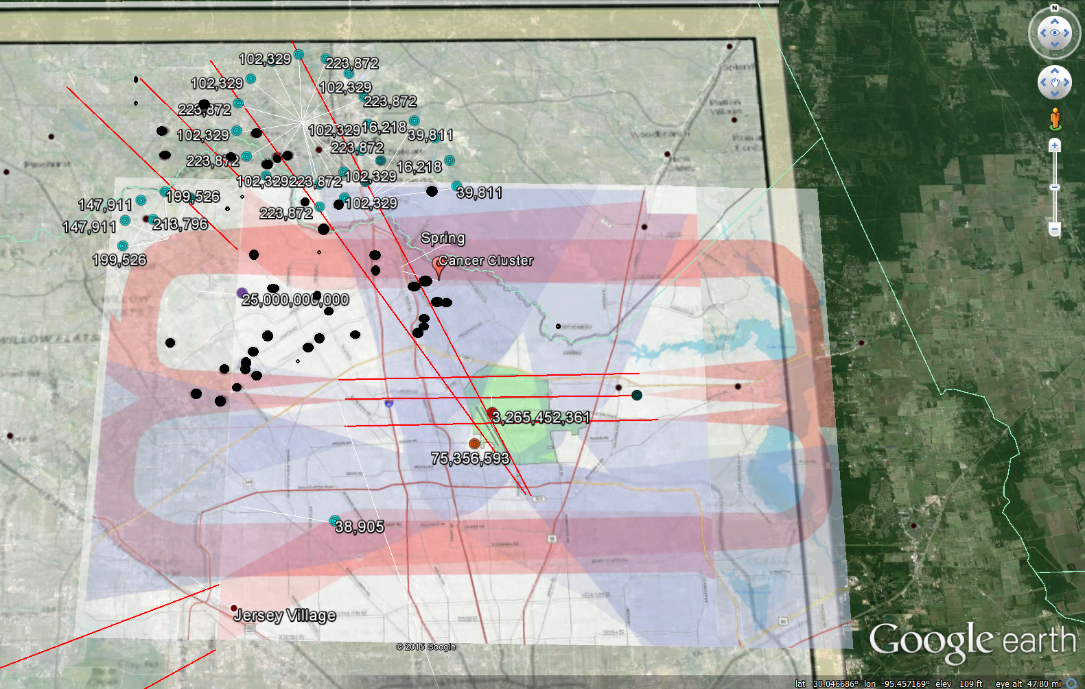 Black dots are incidences of T-cell lymphoma from the study referenced below. Lymphoma appears to be clustered in 3 areas of Houston. My research/theory suggests that areas of 1) high commercial aircraft traffic (with additional radars in the aircraft nose) combined with low flight paths over areas of microwave earthstations and pulsed microwave radars will see increased cancer due to electromagnetic induction of microwave radiation reflecting to the Earth/biology below triggering chronic, low-level electrical currents.