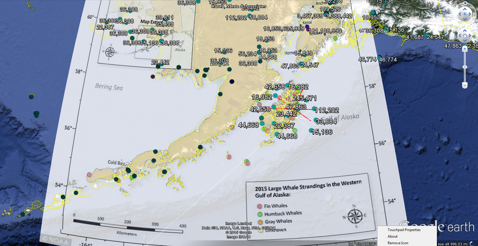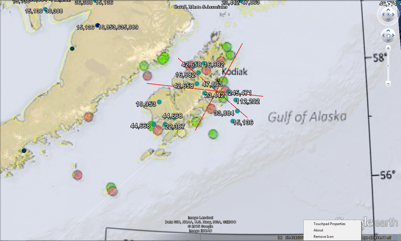 Circles are locations of high gain microwave earthstations (blue) and pulsed microwave radars (red). All values are EIRP watts of radiation. Red lines are airport flight paths. There will be more reflected EMF power density hitting the water surface near airports and low flying aircraft.