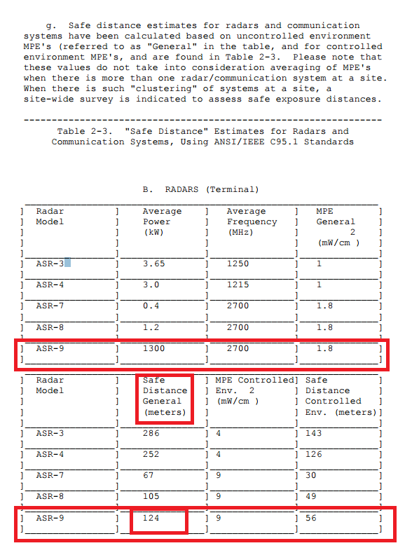 Circle is 124 Meter “Unsafe Zone” around high power, high gain ASR-9 pulsed microwave radar according to the FAA.