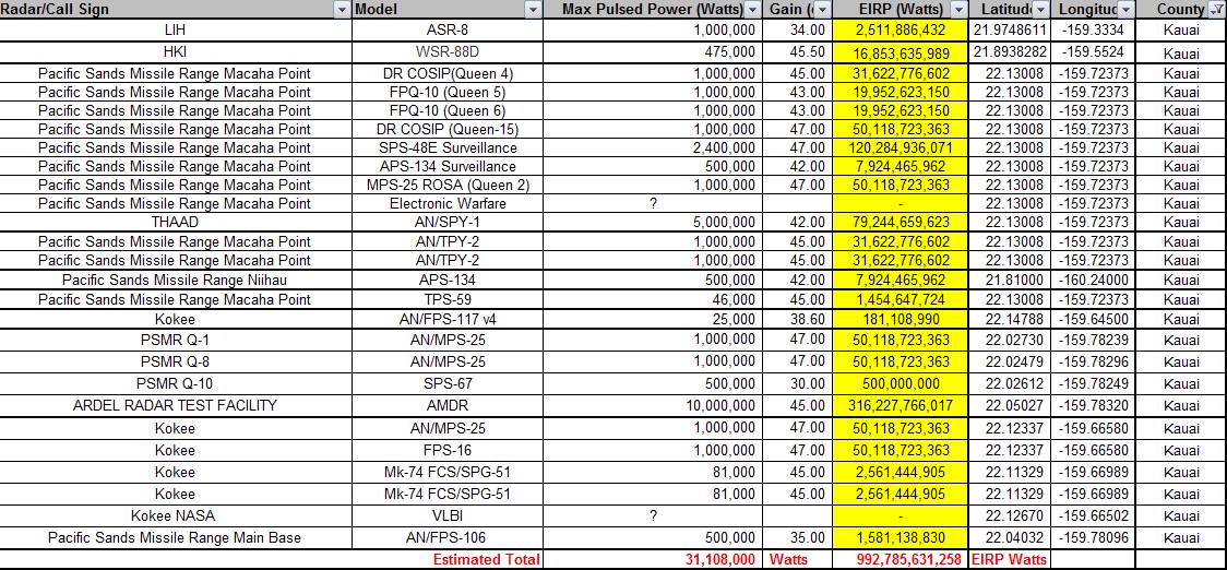 Just look at the map of Kauai and notice the dark red areas along the north shore. This is a trillion watts of focused radiation blasted out into the clouds 200 to 1,000 times a second. This amound of radiation is as much as the HAARP program was using in the isolated outback of Alaska where no one lives!