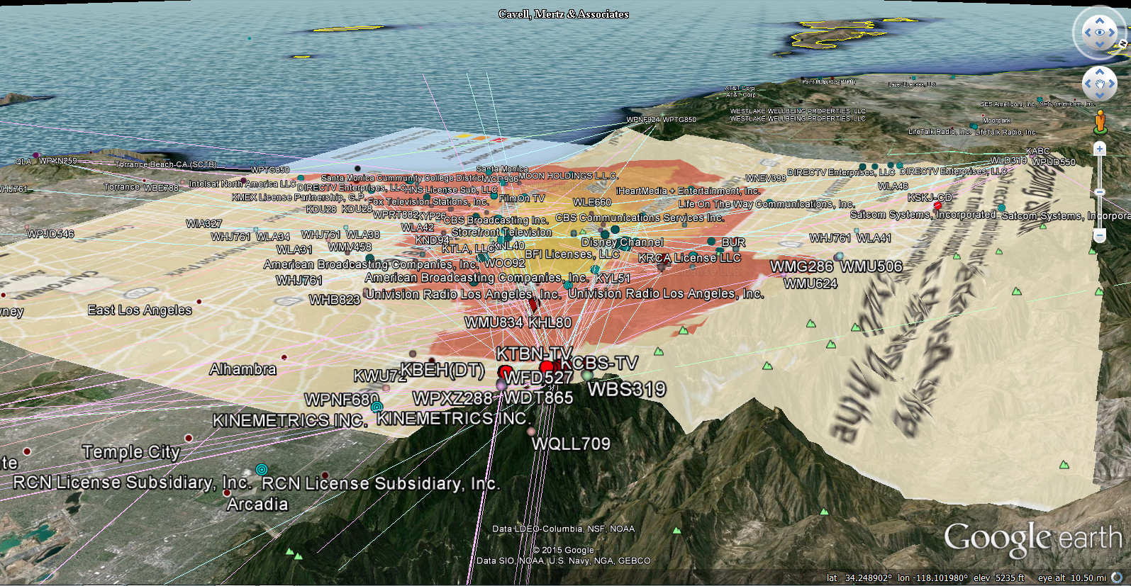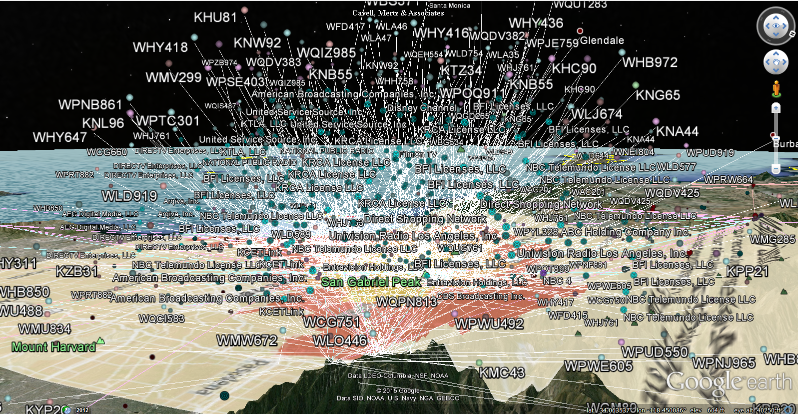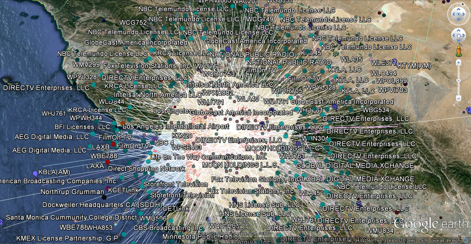View from the East of Hollywood area autism cluster with highest power density of microwave radiation in all of California . Lines are directions of point to point microwave relay towers between studios and mountain towers. Blue and red circles are microwave satellite broadcast earth stations and airport radars. Autism Cluster identified by Columbia University researchers