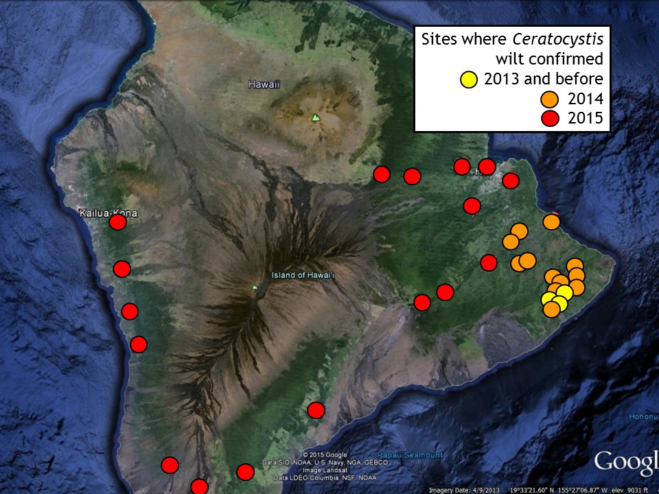 A newly identified disease has killed large numbers of mature ʻōhiʻa trees (Metrosideros polymorpha) in forests and residential areas of the Puna and Hilo Districts of Hawaiʻi Island. Landowners have observed that when previously healthy-looking trees begin to exhibit symptoms they typically die within a matter of weeks.