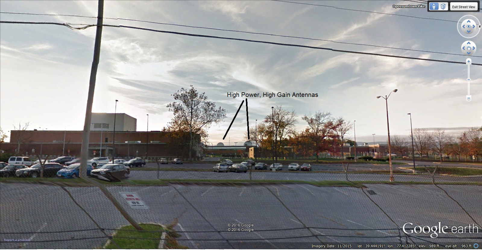 View from Opossumtown Pike Rd. Antennas are only 1000 ft from road, which is less than the FAA safe distance for a pulsed radar of the same average power and gain.
