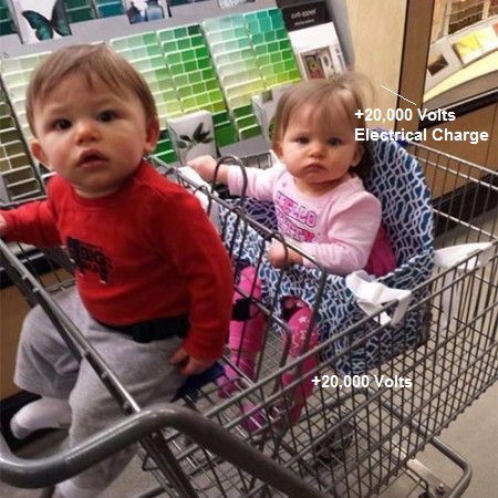Here is a link to an actual test showing 8,000 Volts (electrical potential) easily built up from a grocery store cart. The wheels are generating electrical current continuosly that is flowing into you and your kid’s bodies as you walk down the ailes.