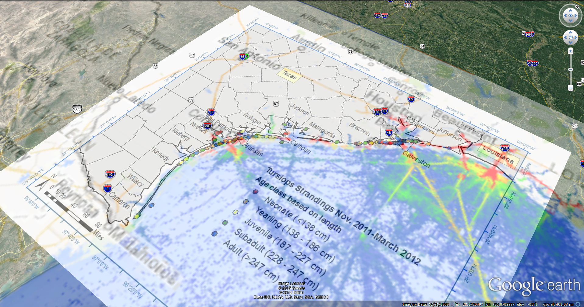 Unusual Mortality event of dolphins and whales in the Gulf (green circles and squares) and shipping lanes (blue, yellow red)