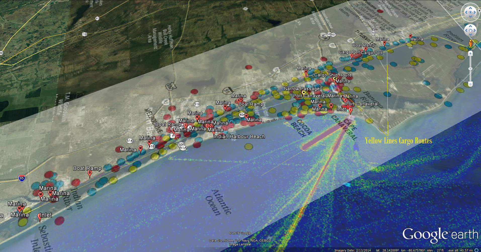 I have attached an updated Google Earth file which shows that the IRL unusual mortality event in Manatees, Dolphins & Pelicans is highly correlated with the following items:1) Port Canaveral & the Barge Canal East/West2) Barge routes to the South and North3) Barge Ports and Marinas4) Areas of Radars/AntennasThe most common form of death in humans around marinas is Electric Shock DrowningThese match the symptoms that the scientist is reporting, ie. “Shock, sudden drowning” – I know, you think eating grass can drown you…The ICCP corrosion protection on many cargo barges, cruise & warships puts up to 500-1500 amps of 50-100V DC current into the surrounding water.AC is worse than DC but those large vessels are putting LOTS of DC current into the water. AC current can leak from regular marinas/boats plugged into 110V AC power“Why fresh water and not salt? Salt-water is anywhere from 50 to 1,000 times more conductive than fresh water. The conductivity of the human body when wet lies between the two, but is much closer to saltwater than fresh. In saltwater, the human body only slows electricity down, so most of it will go around a swimmer on its way back to ground unless the swimmer grabs hold of something — like a propeller or a swim ladder — that’s electrified. In fresh water, the current gets “stuck” trying to return to its source and generates voltage gradients that will take a shortcut through the human body. A voltage gradient of just 2 volts AC per foot in fresh water can deliver sufficient current to kill a swimmer who bridges it. Many areas on watersheds and rivers may be salty, brackish, or fresh depending upon rainfall or tidal movements. If you boat in these areas, treat the water as if it were fresh just to be on the safe side.