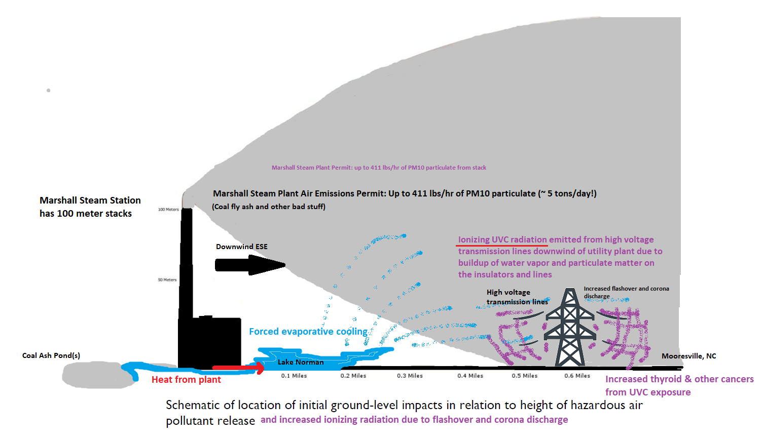 Others are looking to sequestered coal ash as the cause of the high rates of thyroid cancer to the East of Marshall Steam Station, which I disagree with. Downwind implies an airborne emissions source (fly ash, etc). The fly ash/particulate and condensed water vapor(when dew point is high) will build up on high voltage transmission lines and increase external ionizing radiation (Corona discharge/UVc). External Ionizing radiation is a known cause of thyroid cancer according to Duke Energy’s MIT Scientist 🙂