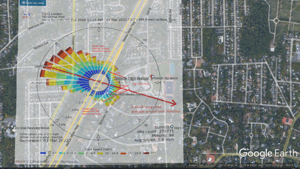 Colonia High School, an area of high brain-cancer rates, is downwind and within 600′ of two gas stations(some local homes are even closer!), and the Garden State Parkway. The school is within an area of high air pollution/particulate and will see exposure to increased Benzene and other hazardous air pollution emissions. Look for the military-industrial complex to search for other less likely causes to deflect culpability.