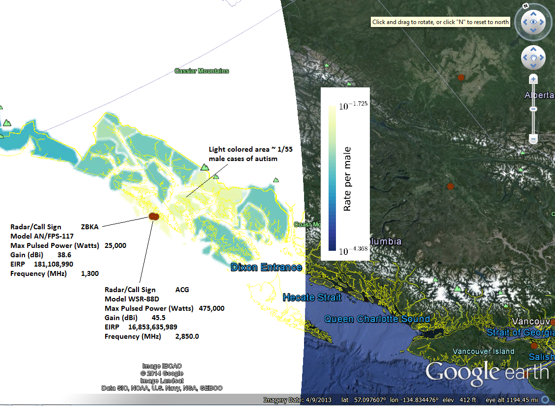 Two High-Powered Pulsed Microwave Radars in Sitka, AK near center of Yellow Cedar Disease. It appears to be much worse on the West Facing Sides of the Mountains which would get more direct/reflected pulsed microwave radiation. One NEXRAD radar and one AN/FPS-117 Military Radar plus microwave/cell towers